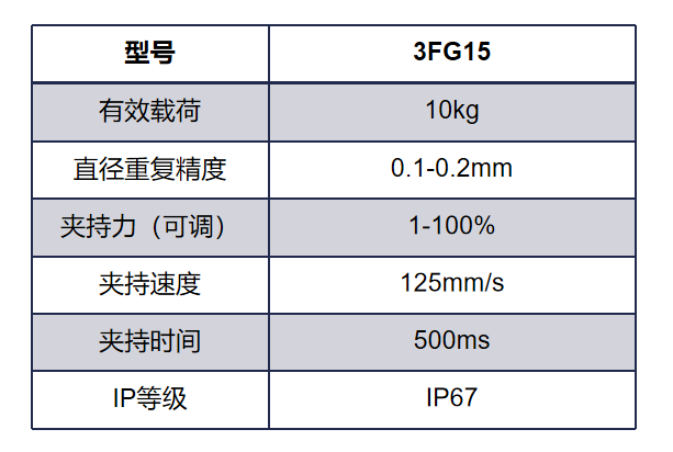 3FG15 三指夾持器的最大行程為 150mm,可謂令人矚目,且設計線條流暢,可以輕松應對多個流程。其理想適合抓取寬度 20mm 至 150mm 的各種圓柱形物體,有效載荷高達 15kg,抓握力 10 N 至 240 N,完勝尺寸較大、操作相對笨重且不靈活的抓指。